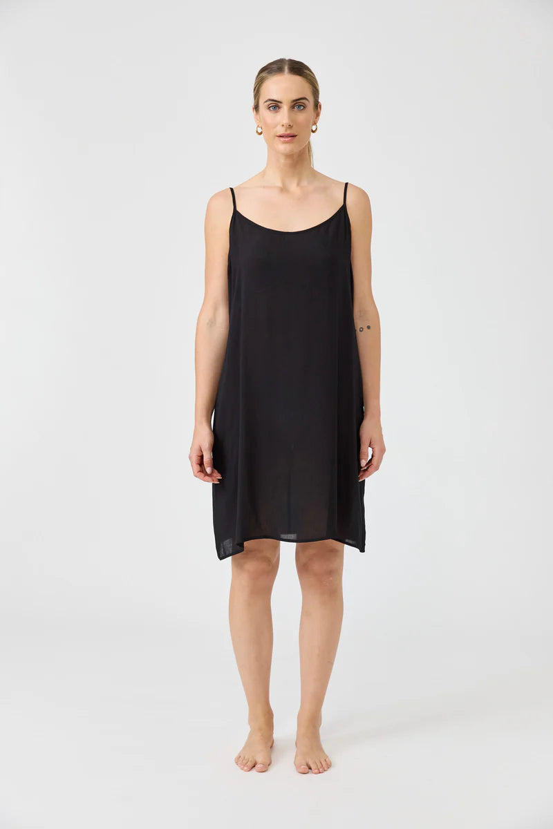A simple layering essential slip. Crafted from lightweight rayon for smooth comfort. Features a scoop neckline, adjustable shoulder straps, and knee-length cut.