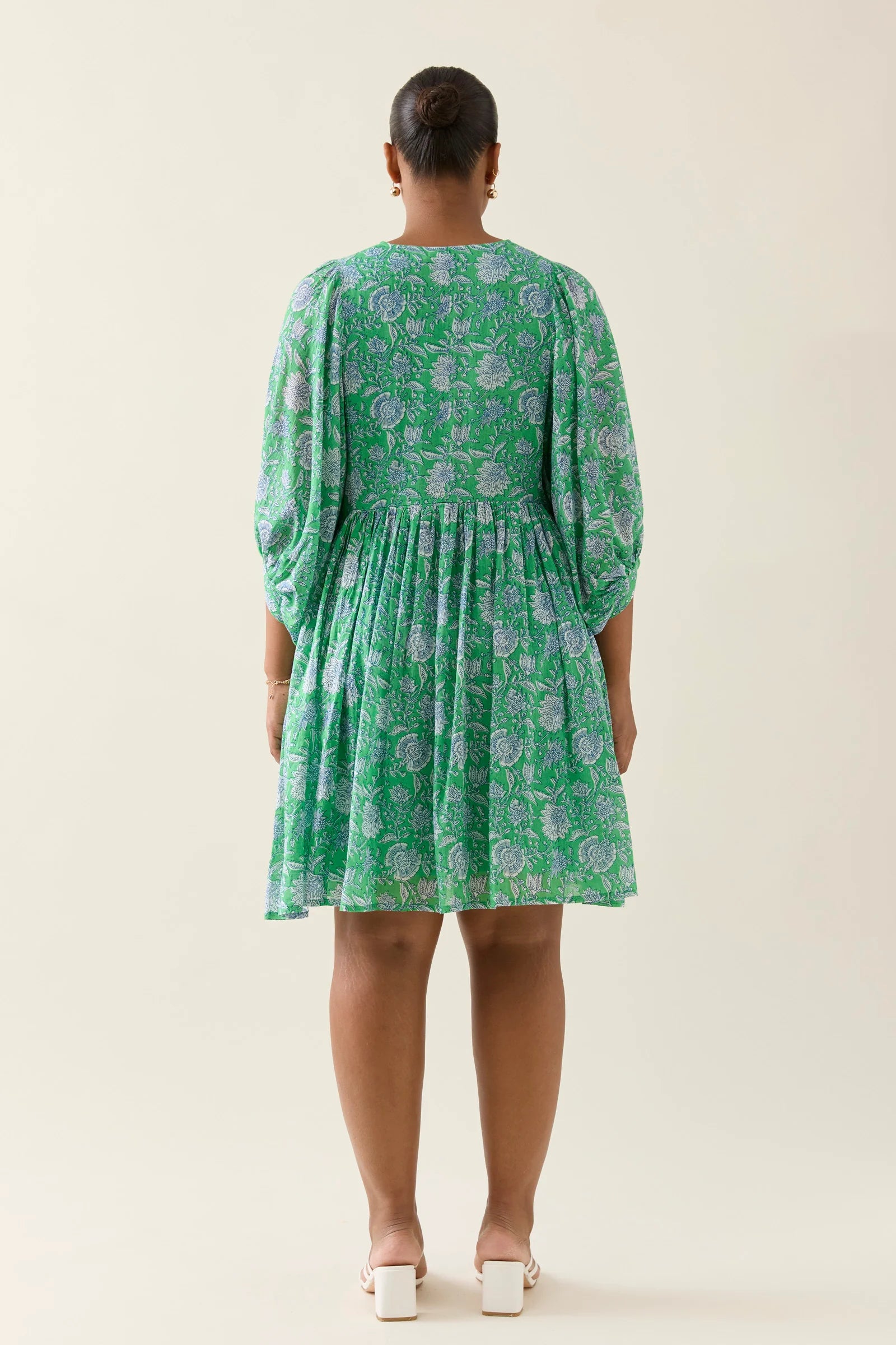 The Wilma Dress is crafted from lightweight cotton voile, hand screen printed for a one-of-a-kind look. Inspired by floral hand-block, and featuring a V-neckline with tassel ties, a gathered waist, 3/4 sleeves. Fully lined for comfort and ready to wear.