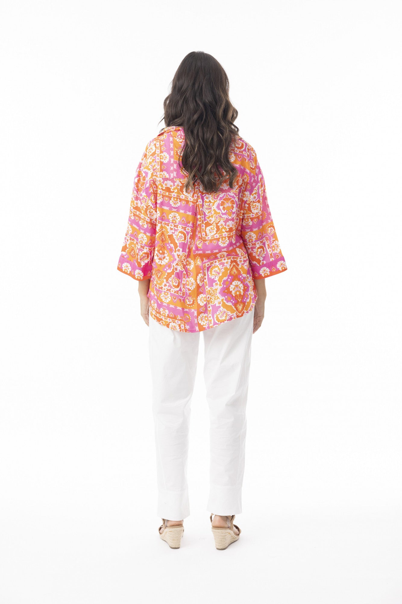 Capture the essence of summer with our playful Montevideo Pink 3/4 Sleeve Top. This classic silhouette features long sleeves and a crisp collar, blending timeless style with vibrant hues. Perfect for adding a pop of colour to your outfit, this shirt is a versatile addition to any fashion-forward wardrobe.